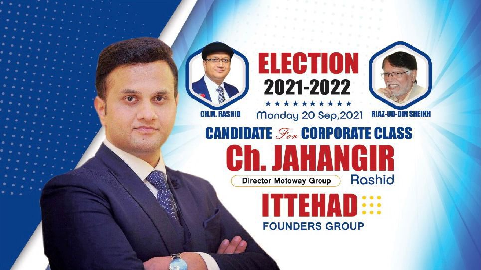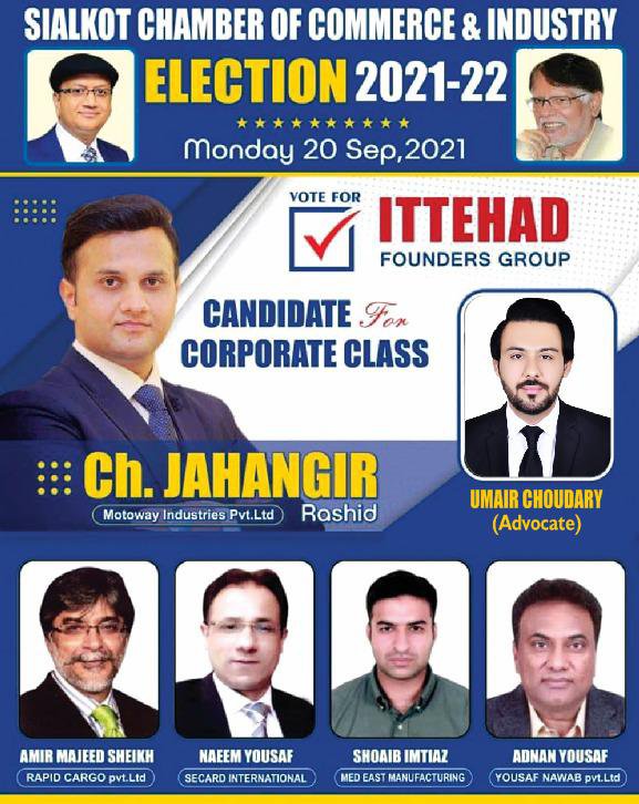 HUMBLE REQUEST FOR YOUR PRECIOUS VOTE AND SUPPORT CANDIDATE FOR CORPORATE CLASS CH. JAHANGIR RASHEED (MOTOWAY INDUSTRIES) IN SIALKOT CHAMBER OF COMMERCE ELECTION FOR SESSION 2021-22.